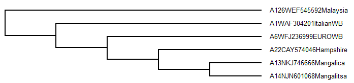 e.g. (((A6WFJ236999EUROWB,(A22CAY574046Hampshire,(A13NKJ746666Mangalica,A14NJN601068Mangalitsa))),A1WAF304201ItalianWB),A126WEF545592Malaysia);